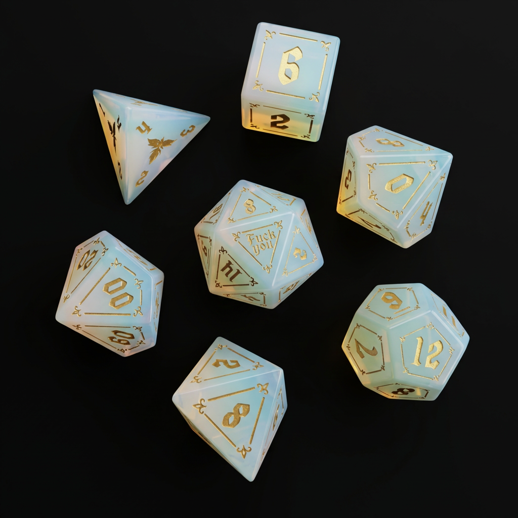 In a D&D setting, opal belongs to Fey courts, dream-oracles, and glamour mages. It’s the stone you’d find set into a circlet worn by someone who never answers directly, or embedded in a wand that casts illusions “too beautiful to be trusted.” Opal dice feel like rolling with fate’s attention on you—every face flashing a different possibility, every outcome a thread pulled from a wider tapestry.